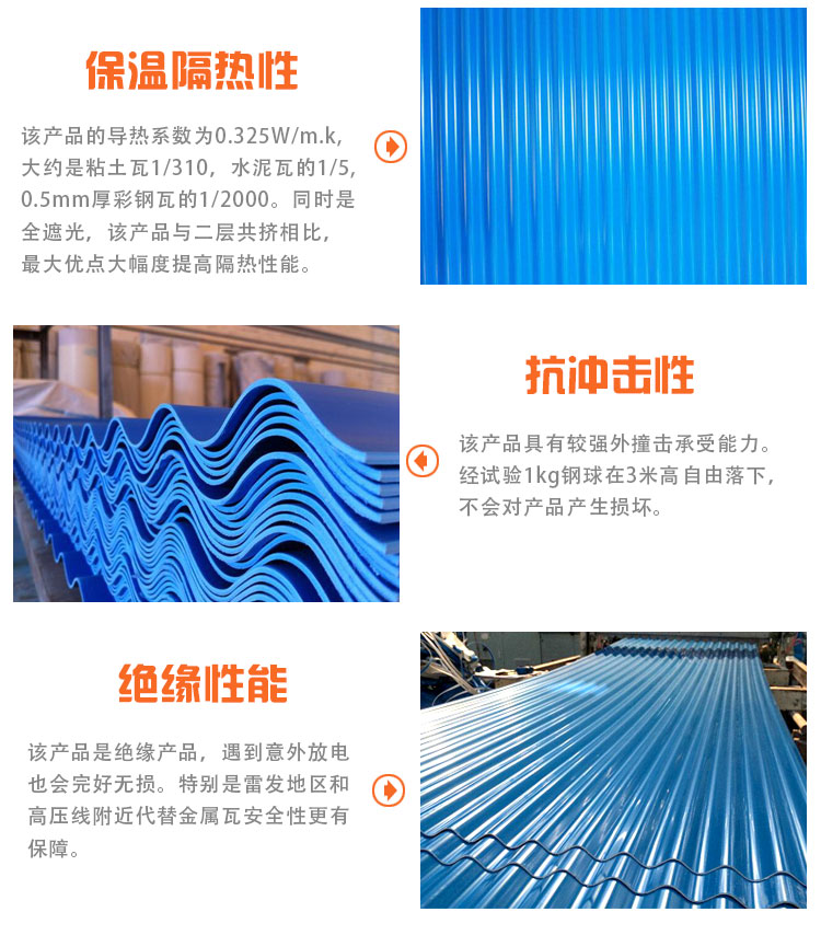 6、低噪音—下雨時噪音特低,比金屬屋面板的噪音降低30db以上;